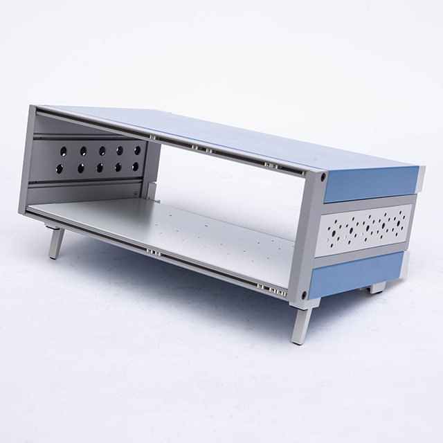 A型機箱由上蓋板,下蓋板,前面板,后面板,側板,底腳,把手,前后梁等配件組裝而成,為臺式機箱。標配型機箱表面經噴塑處理,噴塑的塑粉顏色可以按照客戶要求選定,白、灰色為行業首選的經典顏色。另前、后面板可以做氧化等工藝處理。此款機箱側板是由固定尺寸的鋁型材機床加工后組裝而成